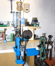 Begonnen habe ich mit einer Ein-Stationen-Presse von RCBS - der Rock Chucker! Ich bin sehr zufrieden mit ihr gewesen und ich habe sie auch nach dem Kauf der Progressivpresse behalten, um dort Kleinserien von Probeladungen zu produzieren. Allerdings verläßt einen bei einem Munitionsverbrauch von etwa 300-500 Schuß/Monat schnell die Lust, da man für jeden Arbeitsschritt die Matrizen neu justieren muss. Eine ziemlich langwierige - und nach Erlangung einer gewissen Erfahrung - auch langweilige Tätigkeit!