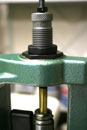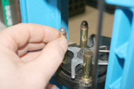 Im nächsten Schritt weite ich den Hülsenmund mittels der Hülsenweitmatrize soweit, daß ein Geschoß, welches man probeweise einsetzt, 1 - 2 Millimeter in die Hülse rutscht und aufrecht stehen bleibt. Das gewährleistet ein schnelleres Arbeiten beim Geschoßsetzen, da man ein Verkanten des Geschosses beim Einpressen in die Hülse weitgehend vermeidet. Einen geweiteter Hülsenmund ist am einfachsten mit einem kleinen Trichter vergleichbar.