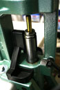 Um alle Abweichungen, die Hülse, Geschoß oder Pulvermenge mit sich bringen, so klein als möglich zu halten, versucht man natürlich immer die gleichen Voraussetzungen zu schaffen. Wiederlader nennen diesen Arbeitsschritt Kalibrieren. Das bedeutet, daß man möglichst alle Maße der Patrone auf das der Originalpatrone bringt. Wenn die Hülsen also gesäubert wurden, stellt man die Patrone in den Hülsenhalter der Presse, in die vorher die Ausstoßermatrize eingeschraubt und justiert wurde. Mit einem Auf- und Ab der Presse wird die Patrone außenkalibriert und gleichzeitig das alte Zündhütchen ausgestoßen.