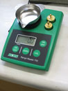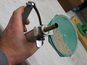 Den vorher genannten Pulvertrickler stelle ich immer so neben die Waage, daß das Tricklerrohr über der Waagschale positioniert ist. Somit kann ich bei Ladungen, bei denen ich wirklich zu 100 % identische Füllungen garantieren möchte, die fehlenden Pulverkörnchen direkt auf die Schale werfen. Das bedeutet aber, daß der Pulverfüller so justiert wurde, daß er zuverlässig 0,2 grain weniger als geplant auswirft.