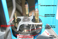 Das Einsetzen der Zünder sollte man nur mit aufgesetzter Schutzbrille erledigen, da es hier auch einmal zu Zündungen kommen könnte! Aber keine Sorge - dieser Fall ist bei mir noch nie eingetreten. Das Einsetzen der Zündhütchen kann durch ein Handsetzgerät oder durch eine Vorrichtung geschehen, welche an den meisten Ladepressen angebracht ist. Ich persönlich bevorzuge bei Benutzung einer Einstationenpresse die Nutzung eines Handsetzgerätes, da durch das Zündhütchenmagazin ein schnelles Setzen ermöglicht wird. Bei der Dillon 550B geschieht das Entfernen des alten und Setzen des neuen Zündhütchens automatisch in der Station 1. Dabei wird mit sanftem Druck das Zündhütchen in die Zündglocke des Patronenbodens gepresst. Hierbei sollte darauf geachtet werden, daß das Zündhütchen mindestens plan mit dem Hülsenboden abschließt.